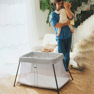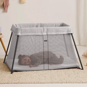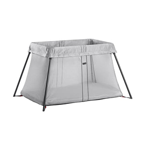 The BabyBjorn Travel Cot Light in Silver makes sleeping away from home with a baby or toddler super easier. It’s just as simple to fold up and pop back into the carry bag. The travel cot stands firmly on the floor and the soft mattress makes it a comfortable and snug place for your little one to sleep at home or away.