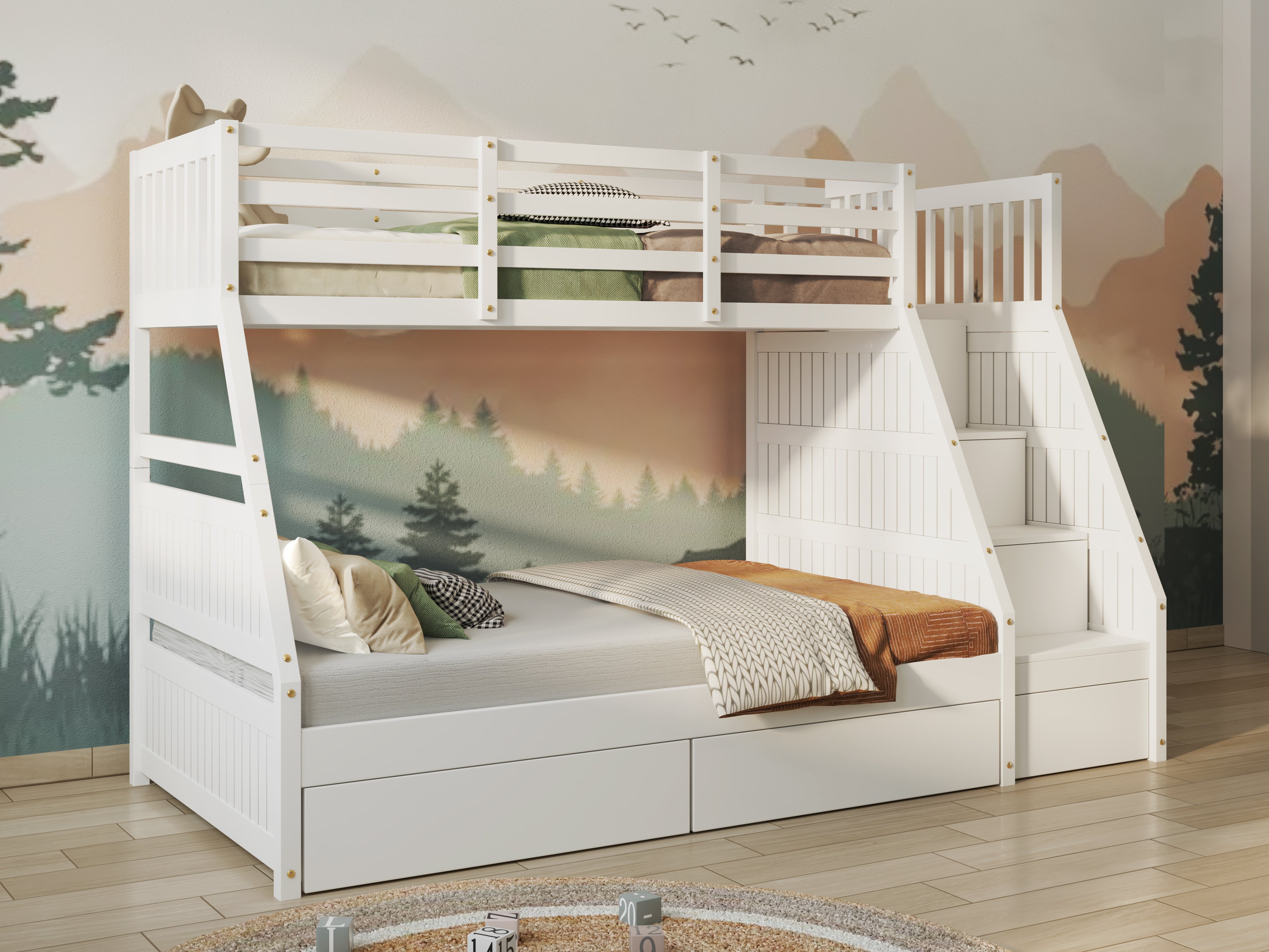 Host the best sleepovers ever with our functional Triple Bunk Bed. This stylish bunk bed offers a flexible sleeping solution with a single top bunk and a comfortable double lower bunk with spacious under bed drawers. The safe staircase access and ample storage make it a perfect addition to any child's room. Enjoy a clutter-free and organised space with this adaptable and charming bunk bed.