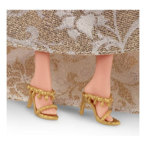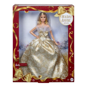 Celebrate the season with the 2025 Holiday Barbie Doll, shining bright both in and out of her packaging! Dressed in a stunning silver and gold damask gown with a strapless ruffle tulle collar, Barbie embodies elegance and festive spirit. Accessories include gold drop earrings and pearlized gold heels, while her long, blonde hair and perfectly styled makeup complete the classic holiday look. Ideal for display, this collectible includes a doll stand and Certificate of Authenticity. Designed for fans 6 years and up. Colours and decorations may vary.