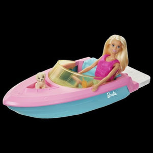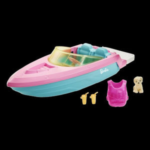 Take Barbie adventures from land to sea with the Barbie Boat that really floats! Designed for imaginative play, this vibrant pink and blue speedboat can hold up to three dolls (sold separately) and even features a special seat for Barbie’s pet puppy. Kids can outfit their dolls with the included hot pink life vest, ride through the waves, or park the boat to relax on the stern using the plug-and-play cupholders and beverage accessories. A translucent yellow weather shield adds an extra pop of colour, making this boat stylish and fun. Perfect for water play, bath time, or imaginative seaside adventures!