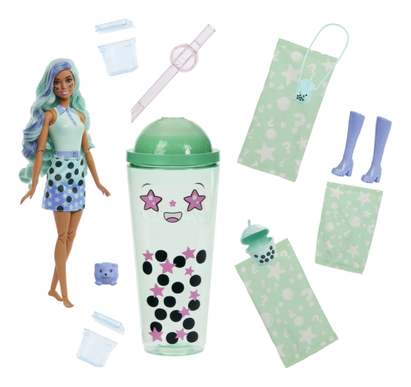 Barbie Pop Reveal Bubble Tea Series dolls offer a sensory unboxing experience with eight surprises! Unscrew the lid with the Slime and poke through the film with the straw for squishy fun. Peel the film on the cup to reveal a bubble tea-scented Barbie doll and eight more surprises! Which doll will you reveal? There's Taro Milk, Berry Bliss, Green Tea or Mango Mochi. Continue unboxing to discover two reusable ice cubes that pop open to reveal a skirt and pair of shoes. Mystery bags reveal a straw, a purse and a squishy, scented matching pet! Discover more wow with colour-change transformations on Barbie doll's face. Kids will want to collect them all! Each doll sold separately, subject to availability. Dolls cannot stand alone.