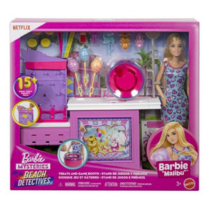 Bring the boardwalk to playtime with the Barbie Mysteries: Beach Detectives doll and game booth playset! Featuring over 20 accessories, kids can drop tokens into the game to win prizes like a pig, tiger, or pinwheel, then swirl up fun with the cotton candy machine. Barbie ‘Malibu’ doll is dressed for sunny adventures in a heart-print dress and white sneakers, ready to inspire beachside stories. Perfect for fans aged 3 years and up.