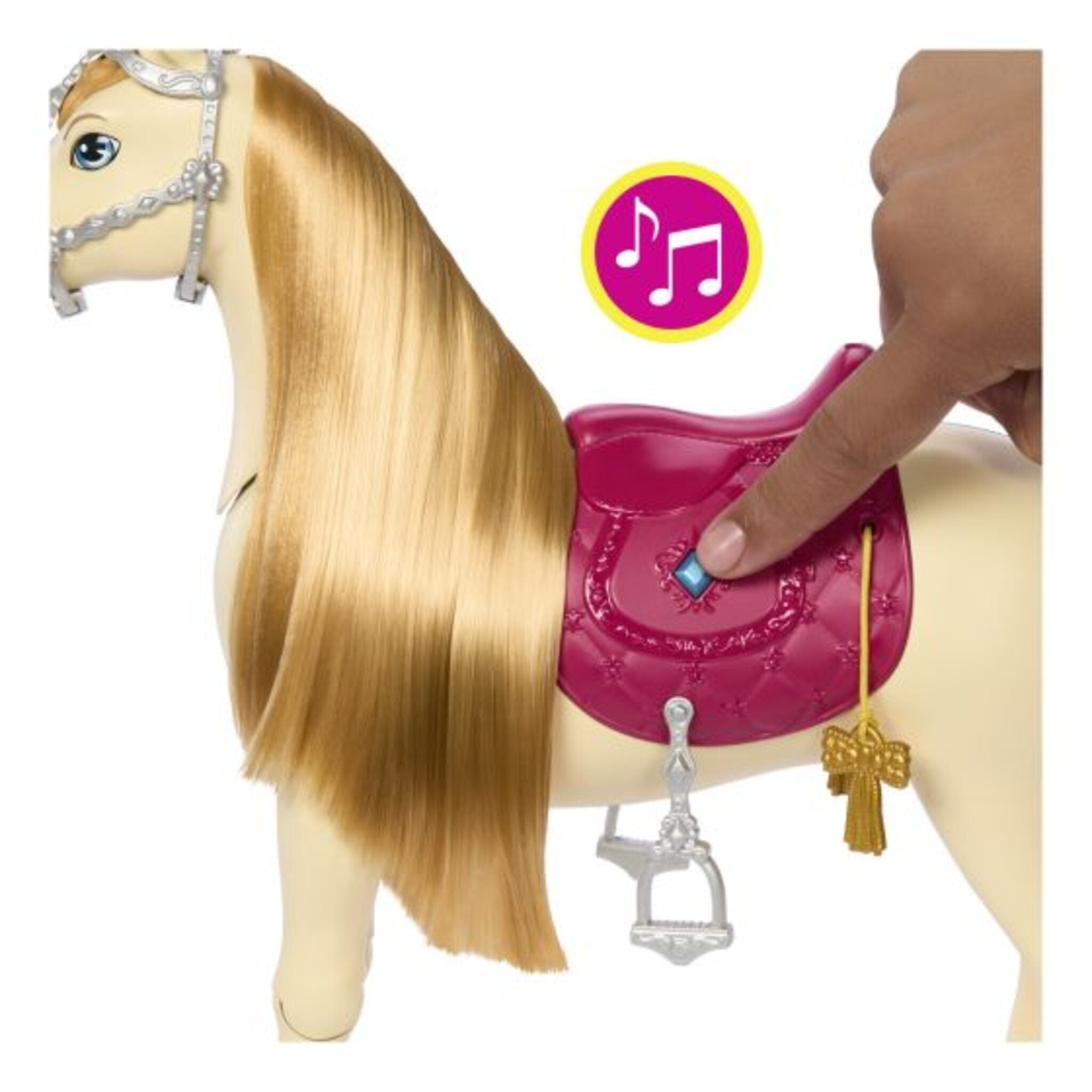 Bring the excitement of Barbie Mysteries: The Great Horse Chase home with Tornado, an interactive toy horse with 20+ sounds and endless play possibilities! Tornado dances, blinks, sings songs from the series, and makes fun noises like neighs, munches, and gallops. Kids can nurture, perform, and style Tornado using accessories like a trophy, food, brush, feeding bin, hair clips, extensions, and gems. Colors and decorations may vary.