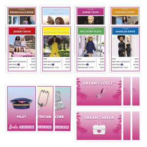 Then they travel the board with a Barbie pink token to buy streets in their Barbie dream world—and build them up with DreamHouses! If they roll a "B" with the Barbie die, they can flex their unique Be Anything skill, giving them an edge over opponents. Live out career and fashion goals by drawing Dream Career and Dream Closet cards.