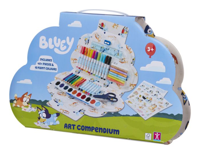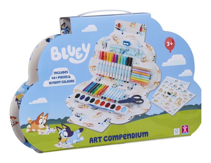 Have lots of creative fun with the Bluey Art Compendium, contains a host of art supplies and stationery. Everything stores inside the lovely cloud shaped carry case with handle, which features authentic Bluey styling. Perfect for encouraging creative play. Product features: Children will love using their Art kit to create their own Bluey masterpieces Your little pup will love this Bluey themed carry case complete with Bluey Branded stationary inside.