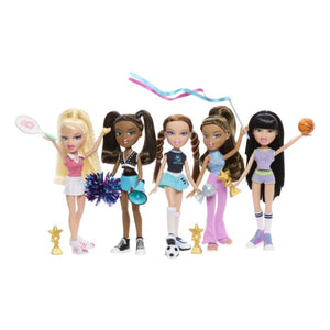 Collect all five Bratz Play Sportz dolls—Sasha, Cloe, Jade, Yasmin, and Roxxi—for the ultimate team of sporty fashionistas.