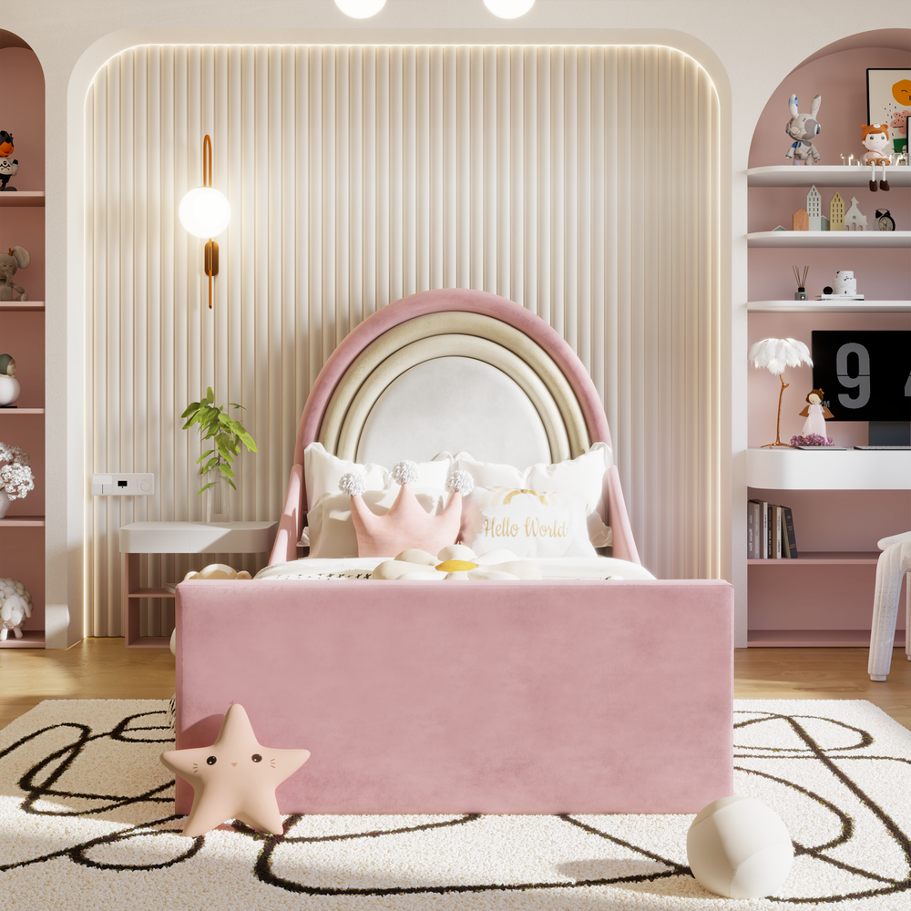 Introducing our Bubblegum Kids Bed; where comfort meets creativity! Designed with a unique curved headboard, this bed adds a touch of whimsy to any child's bedroom.