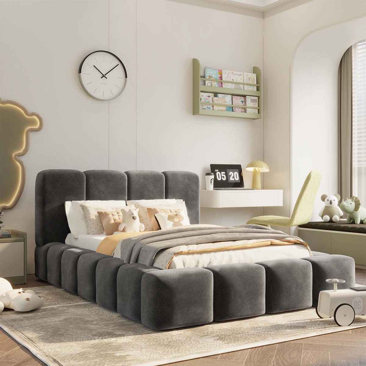 The Chunky Barney Kids Bed offers a fun and inviting sleep space with its unique, segmented headboard and soft, plush upholstery. This playful yet sturdy bed creates a cosy and secure environment for your child's rest, adding a touch of character to their bedroom décor.