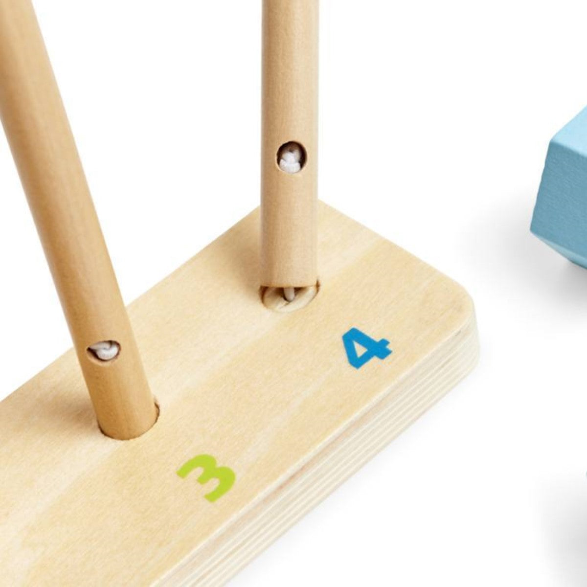 This set includes and wooden base with 4 different sized poles, 1 red bead, 2 yellow beads, 3 green beads and 4 blue beads.