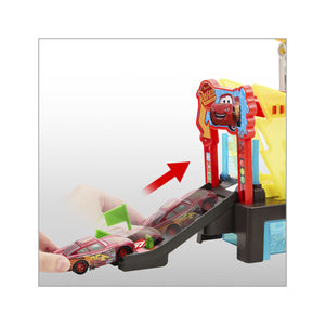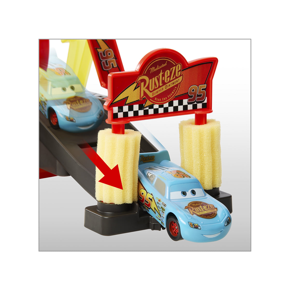 Drive Lightning McQueen up the ramp and raise the green flag to start the fun. Slide the Rusteze button to move him into position for a wash. Fill the Piston Cup with warm water and pour it over him – watch his colours change through the splash-proof window! Then, slide the button again to raise the platform and launch him through the buffers and across the finish line.