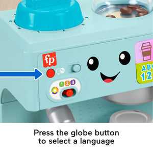 Kids can “grind” beans in the hopper, “steam” milk with the frother, and “brew” up drinks to serve their customers. And with Smart Stages technology, the learning fun grows along with your child with 3 levels of play! Use the globe button to select a language: English, German or French. Colors and decorations may vary.