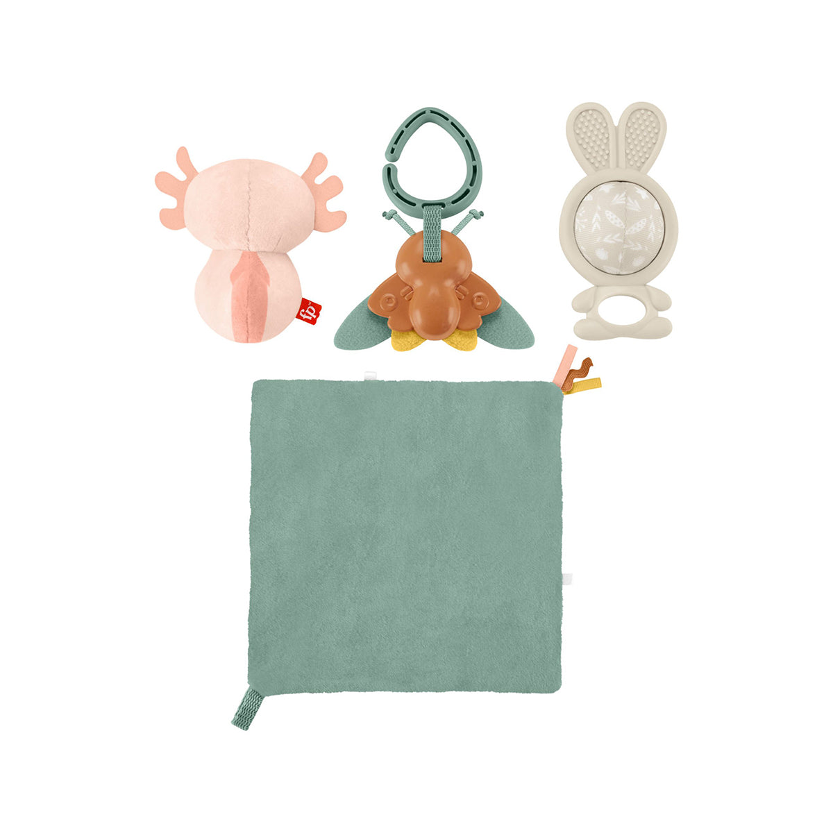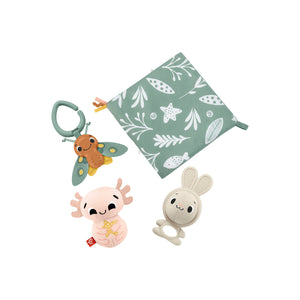 Newborns will love the sensory fun of the So Many Senses Gift Set from Fisher-Price®. This set of 4 baby sensory toys includes a BPA-free bunny teether with pop-out jingle ball, a soft axolotl with chime, a textured moth rattle, and a soft fabric crinkle panel with ribbon tag. Designed to be easy for little hands to grasp, these toys help strengthen fine motor skills while fostering a baby’s developing senses of sight, hearing and touch.