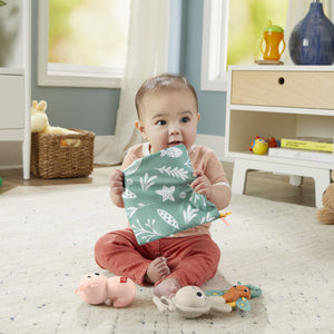 Moth and crinkle panel easily attach to a baby gym, diaper bag or stroller with a convenient link for travel use. Toy set comes in a giftable package perfect for a baby shower or sprinkle.