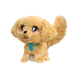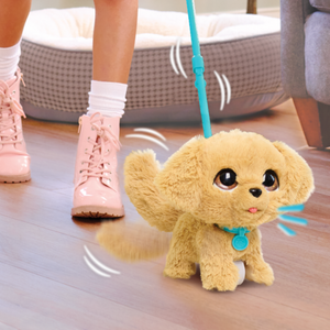 Click the included leash onto the puppy’s collar. Then, with a gentle push motion, take her for a walk around the house to see her tail swish back and forth. Her bouncy walk and wobbly head move just like a real pet. This adorable 8-inch-tall kids’ toy makes cute yips, barks, and sound effects as she travels.