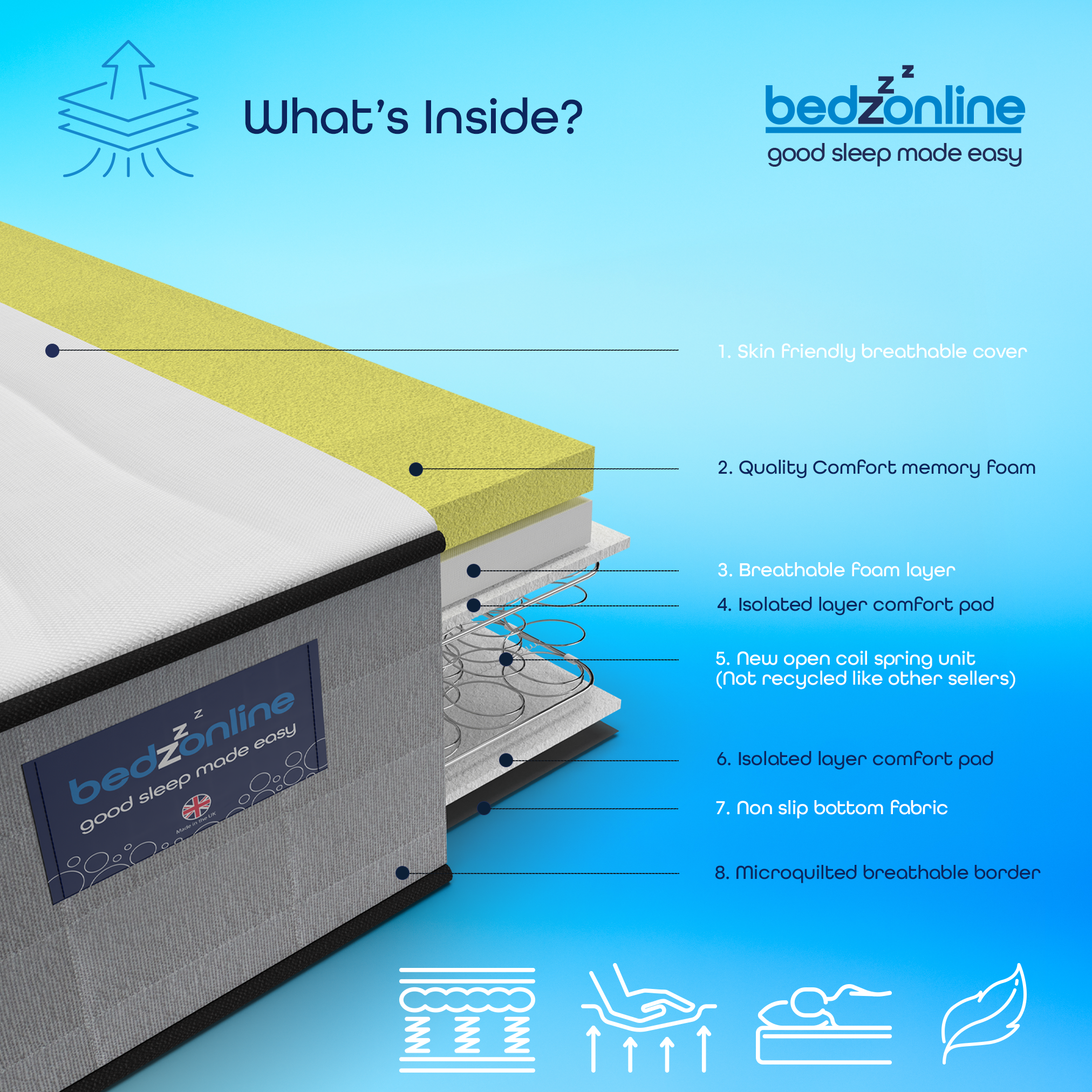 A closer look reveals the hybrid build — individual pocket springs paired with upgraded memory foam that adapts to every curve, delivering gentle support and full-body relaxation all night long.