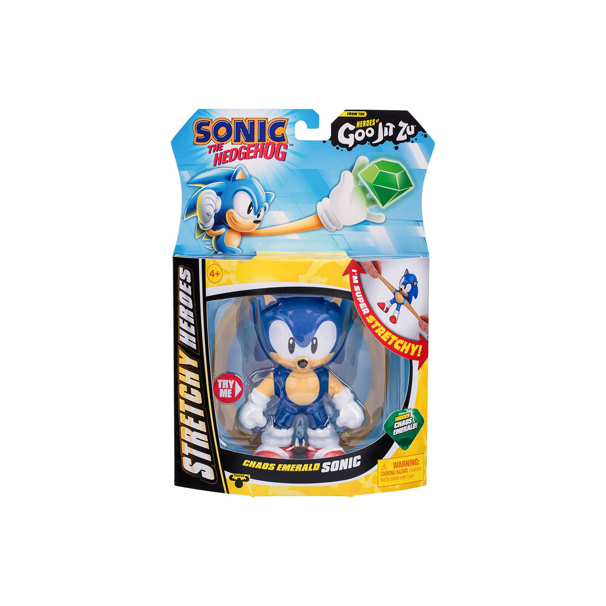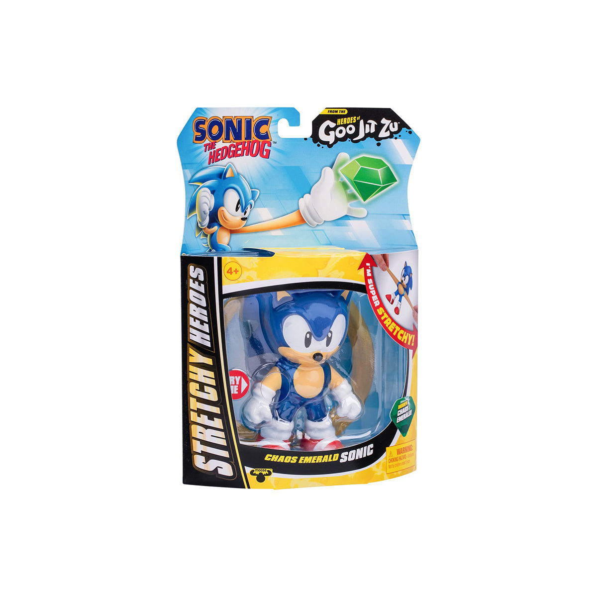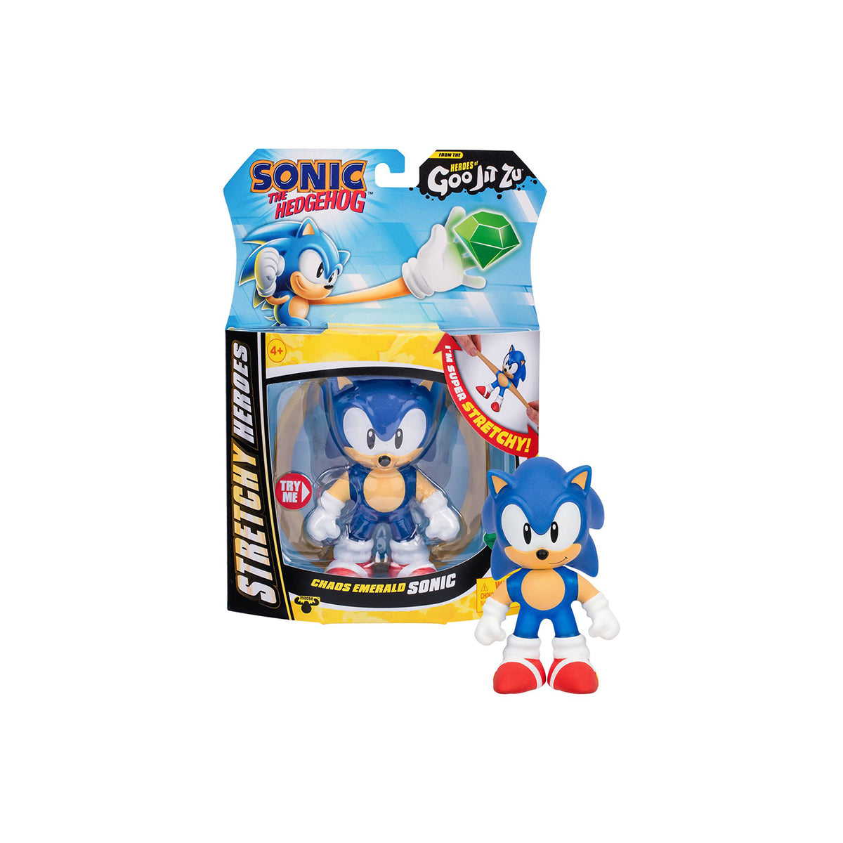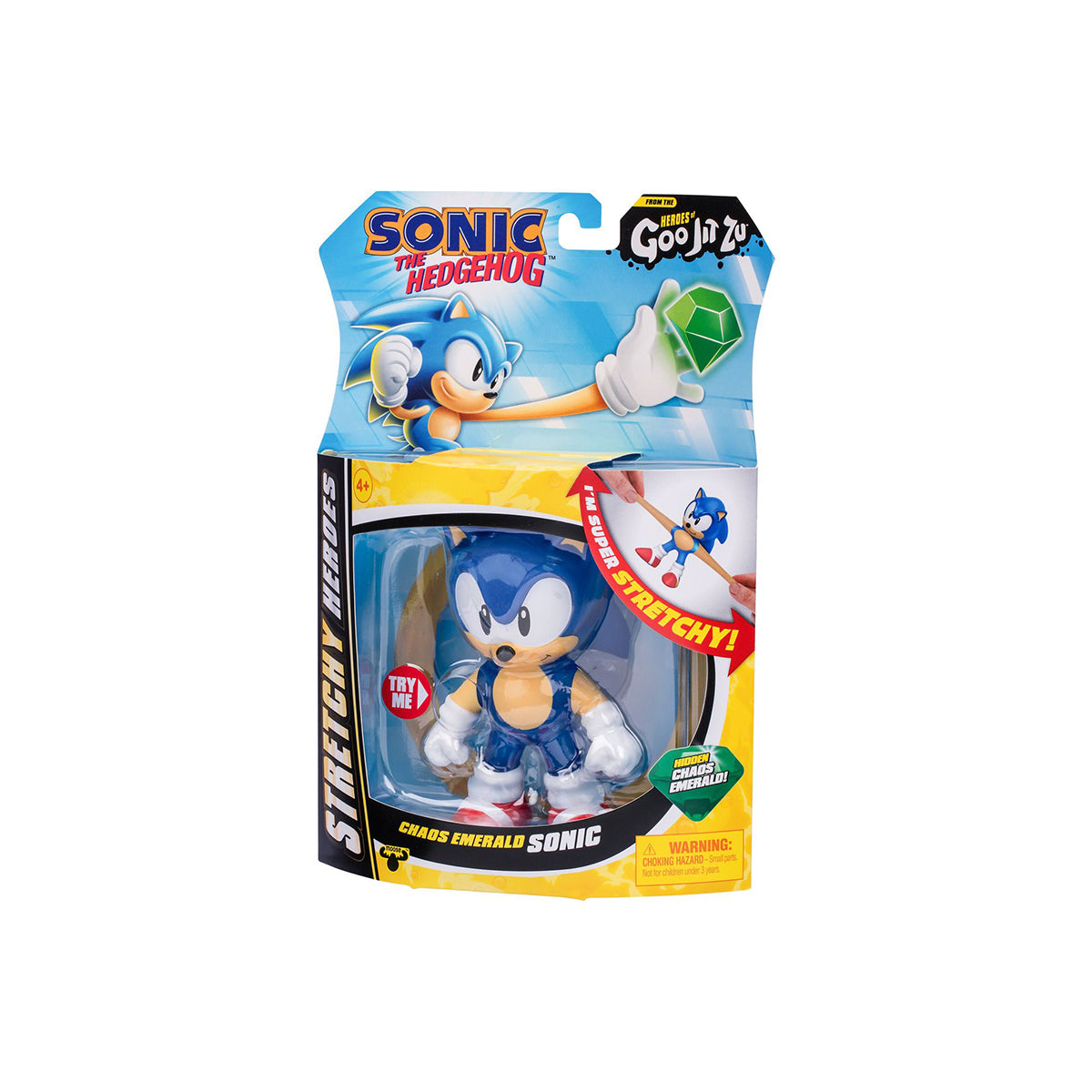 Squeeze, stretch and play with him like never before! Squeeze Sonic's body to discover and reveal the Chaos Emerald within his Goo! Grab him by his limbs and stretch out his arms and legs. Sonic stands at over 4-Inches / 10 CM tall. Wow! He can stretch up to 3 times his size! (His arms can stretch up to 16-Inches / 40cm!)