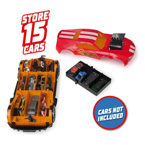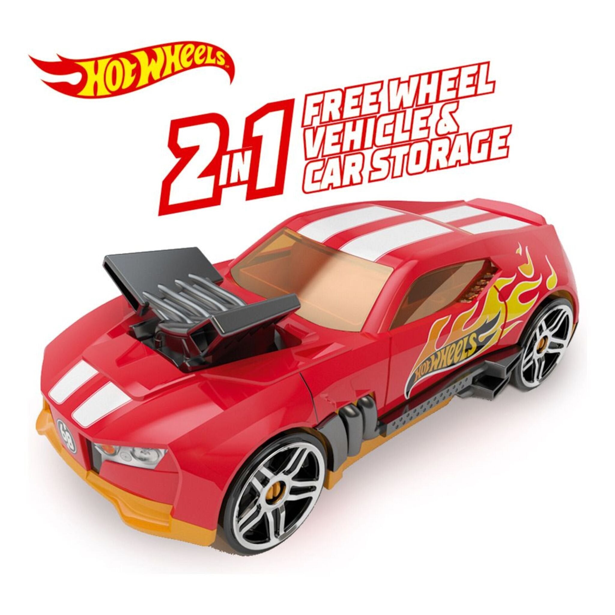 Freewheel Hot Wheels Car 2-in-1 freewheel storage car case. You can either play with the car and at the same time store your favourite Hot Wheels cars and take them everywhere Two levels storage Conveniently store and carry up to 15 Hot Wheels cars in two different levels inside the car. Makes collecting and clean up easy and fun. It features a retractable bumper to make easier carrying it everywhere. Retractable handle to take it anywhere Take your hiddel collection everywhere with the practicar retractble handle.