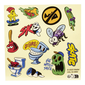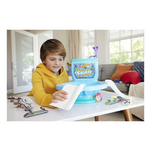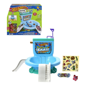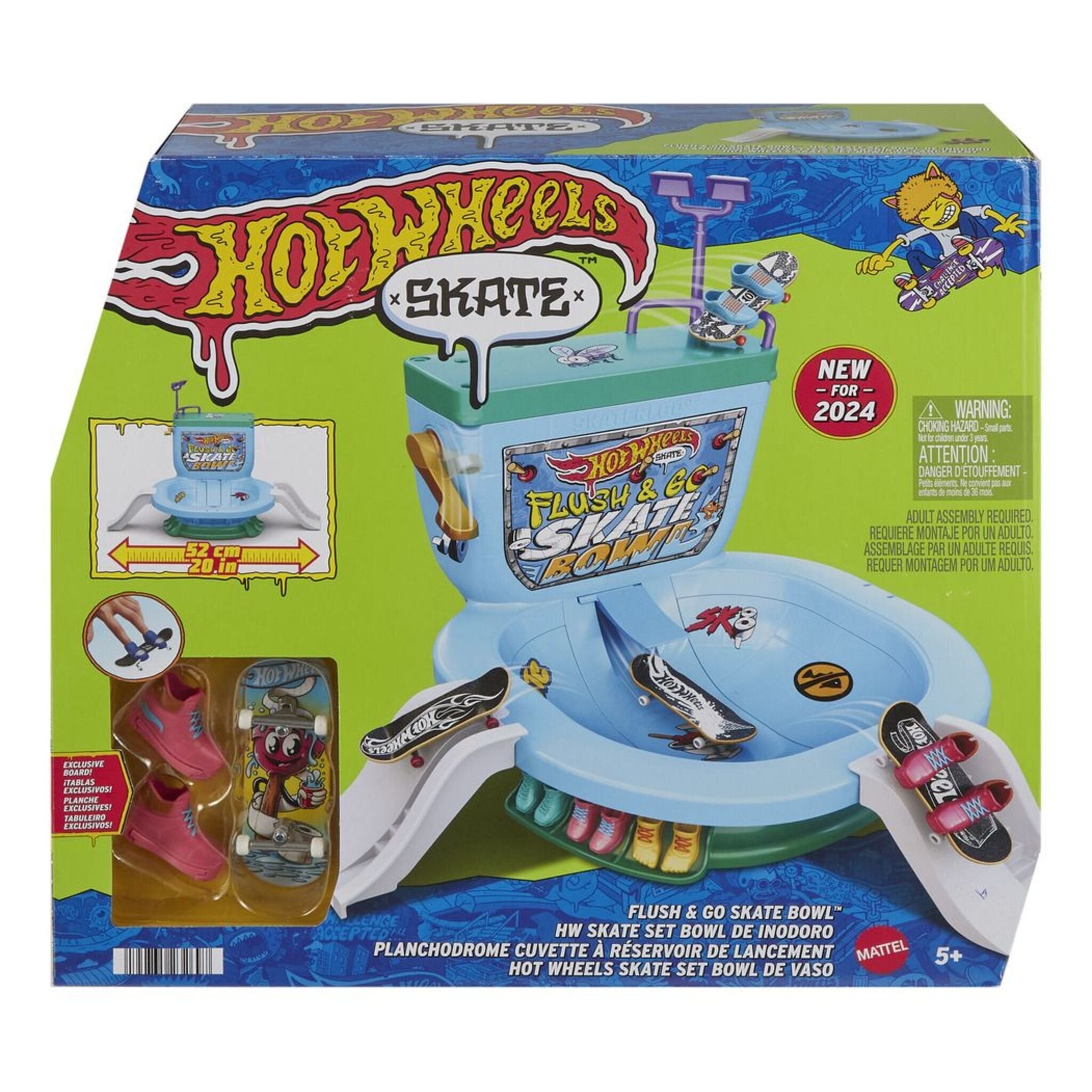 Press the lever on the Hot Wheels Skate toilet bowl to flush out a Hot Wheels Skate fingerboard and start shredding! This set features awesome skate surfaces including a massive bowl, toilet paper ramps, a rear ramp and a grind rail, plus storage for 4 fingerboards and 6 pairs of shoes. One exclusive board is included as well as one pair of removable skate shoes. Additional boards and shoes sold separately. Colors and decorations may vary.
