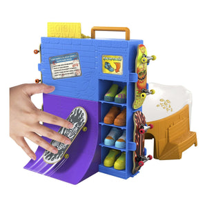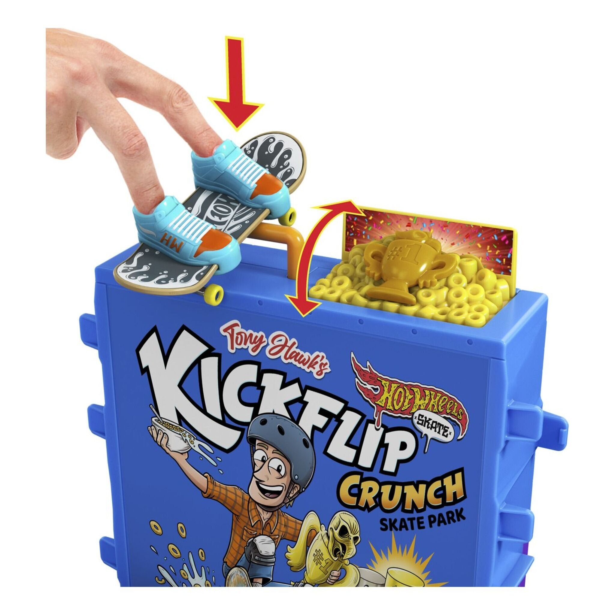Shred through an epic bowl of cereal with the Hot Wheels Skate Tony Hawk Cereal Skate Bowl. Created in collaboration with skateboarding legend Tony Hawk, this cereal-themed skate set invites fingerboarders to skate through a cereal bowl, perform vert tricks on the cereal box before grinding the rail at the top for a surprise trophy reveal. Ride the back ramp and grind the spoon rail for extra flair! It includes one exclusive fingerboard and removable pair of skate shoes with storage for four boards and four pairs of shoes. (Additional boards and shoes sold separately.) Colors and decorations may vary.