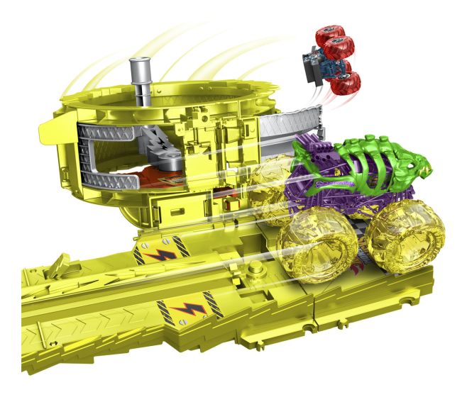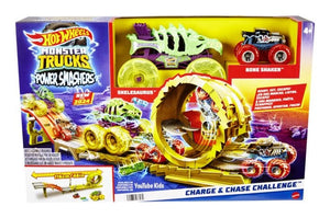 An oversized Skelesaurus and 1:64 scale Bone Shaker face off in a race to avoid destruction! Release the two vehicles with the power switch and see if Bone Shaker can beat out the evil foe as they speed down a hill toward a massive loop. A randomizer selects one of two outcomes: Bone Shaker makes it through the loop and escapes to safety while Skelesaurus gets left in the dust, or Skelesaurus catches its prey, trapping Bone Shaker in the loop, knocking it over. Set includes two crushed cars for extra destruction. Colors and decorations may vary.