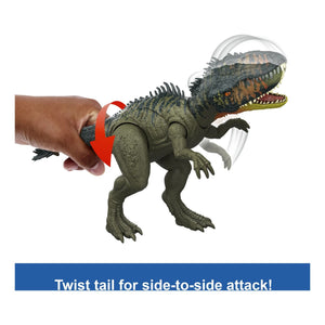 This Gigantic Thrashers Tyrannotitian action figure inspired by Jurassic World Rebirth has 2 dramatic tail-activated attack motions! It's a Total Attack move the tail up and down for has a dramatic head chomping attack and side to side for arm slashing action! At 13.5 inches long, with authentic sculpting, deco and texture, this articulated large species dinosaur toy is ready for battle play or fierce posing.