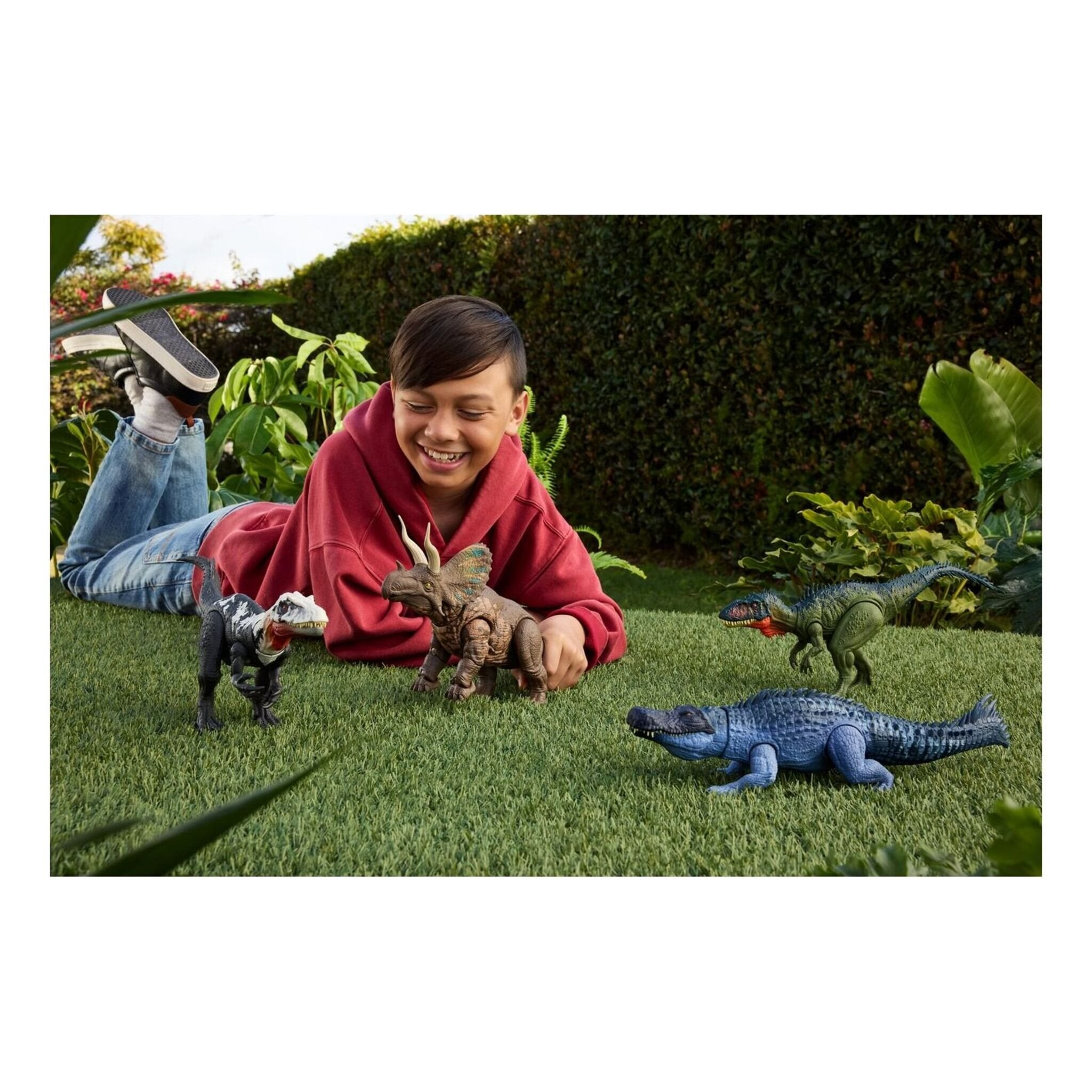 Bring the Jurassic World Rebirth adventure home with the Gigantic Thrashers Eotriceratops! This 14-inch-long dinosaur figure features two dramatic tail-activated attack motions: move the tail up and down for a head-bumping attack or twist it side-to-side for a stomping action.