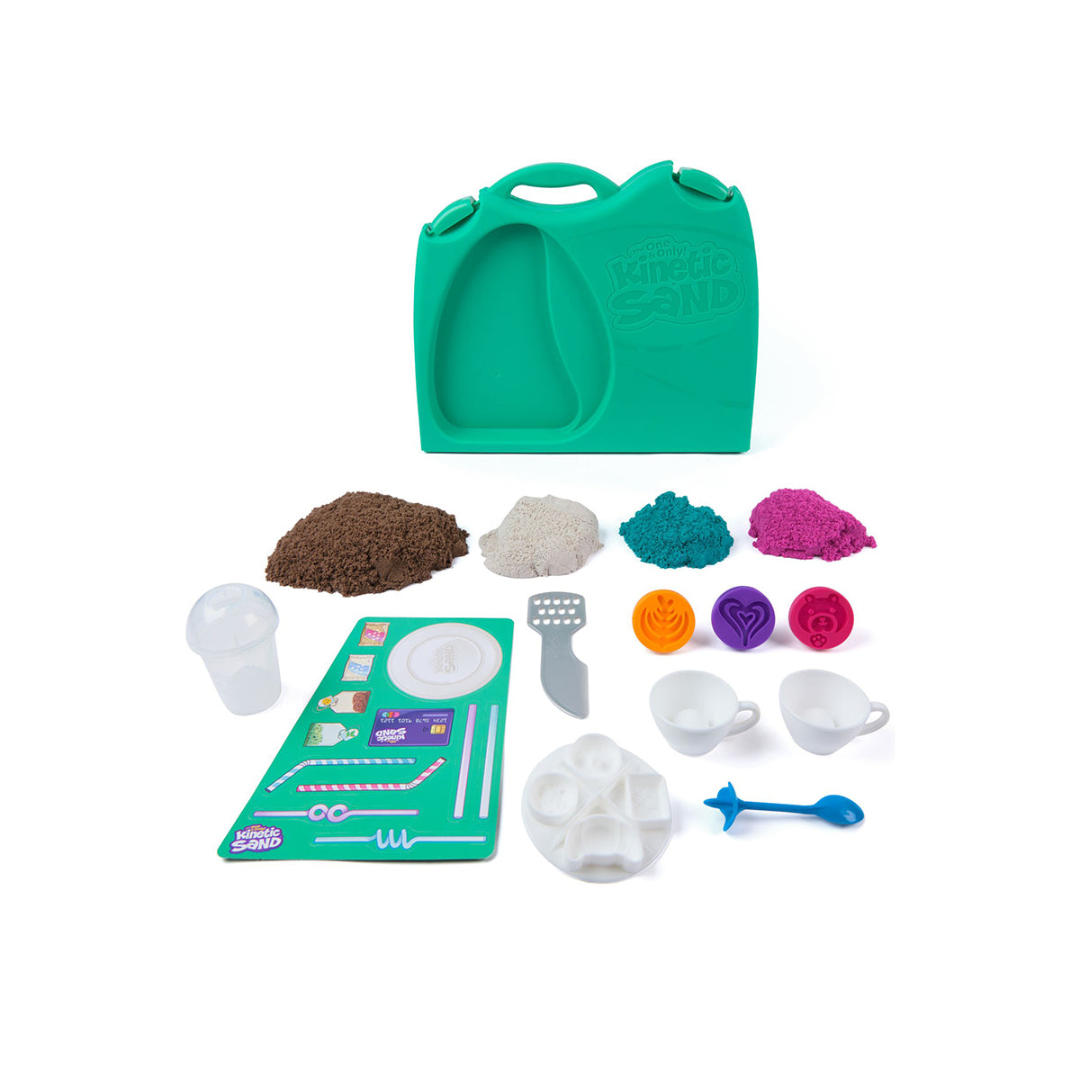 Flow sand into a cappuccino cup and top with moulded whipped cream or a latte art stamp; layer sand in the frappe cup and top with grated sprinkles; mould mini treats croissants, donuts and other shapes, then create again and again. The Café Case keeps sand contained and after play, closes for easy storage.