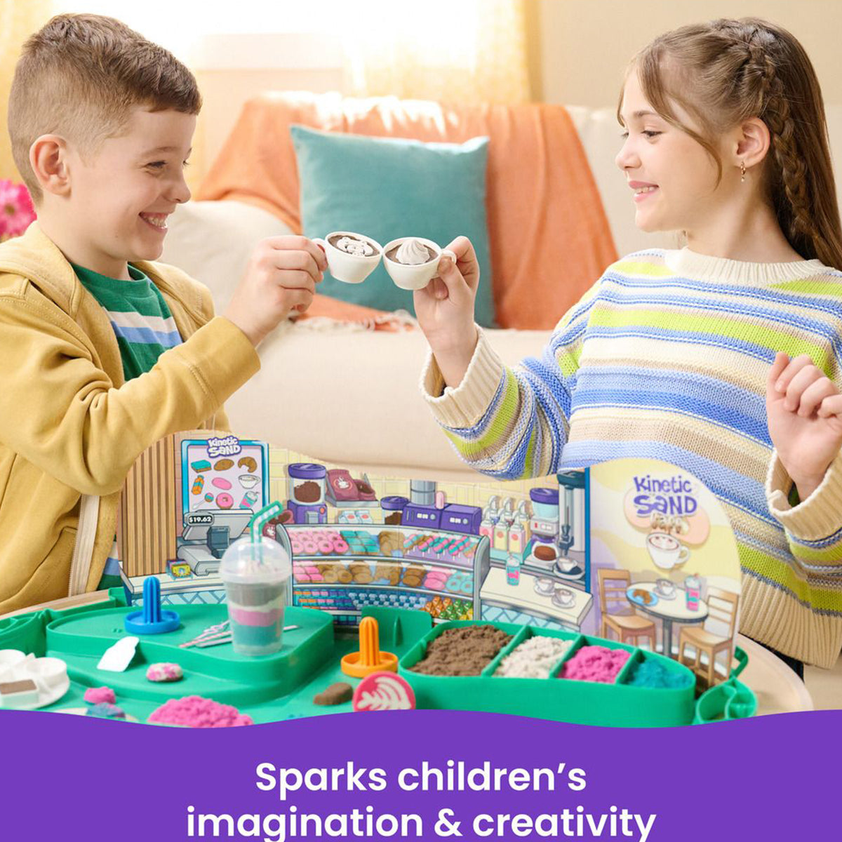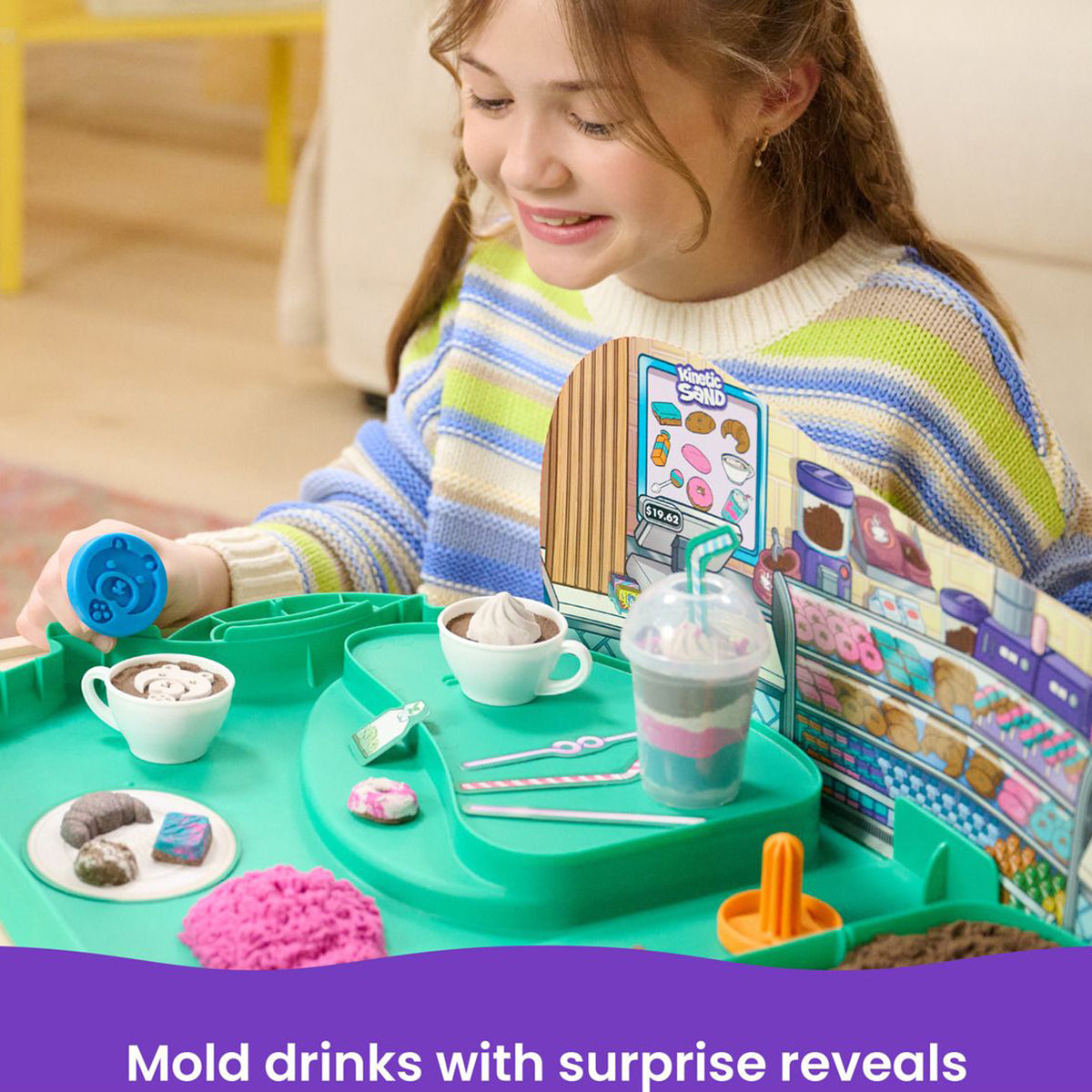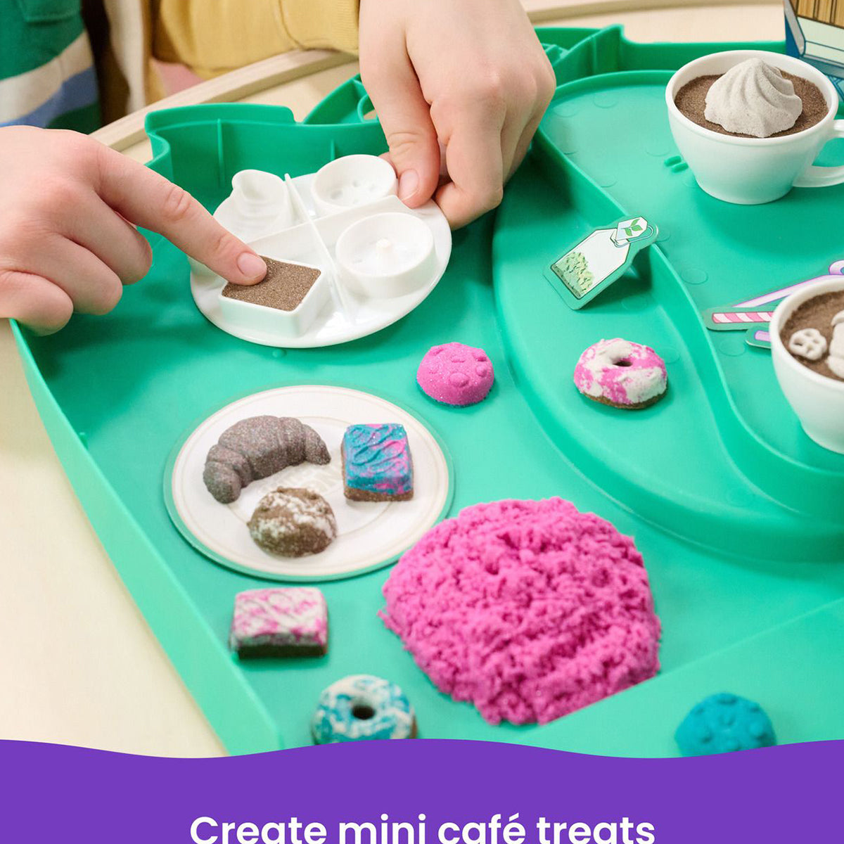 Become a barista with the Kinetic Sand Café Case. This playset will spark imagination and creativity as kids sculpt, shape and mould their own café creations. With 793g Kinetic Sand in 4 vibrant colours (white, brown, teal and shimmer pink), 2 cappuccino cups, a frappe cup, decorative straw cut-outs and more, there’s so many ways to play.
