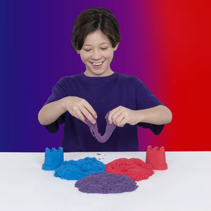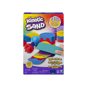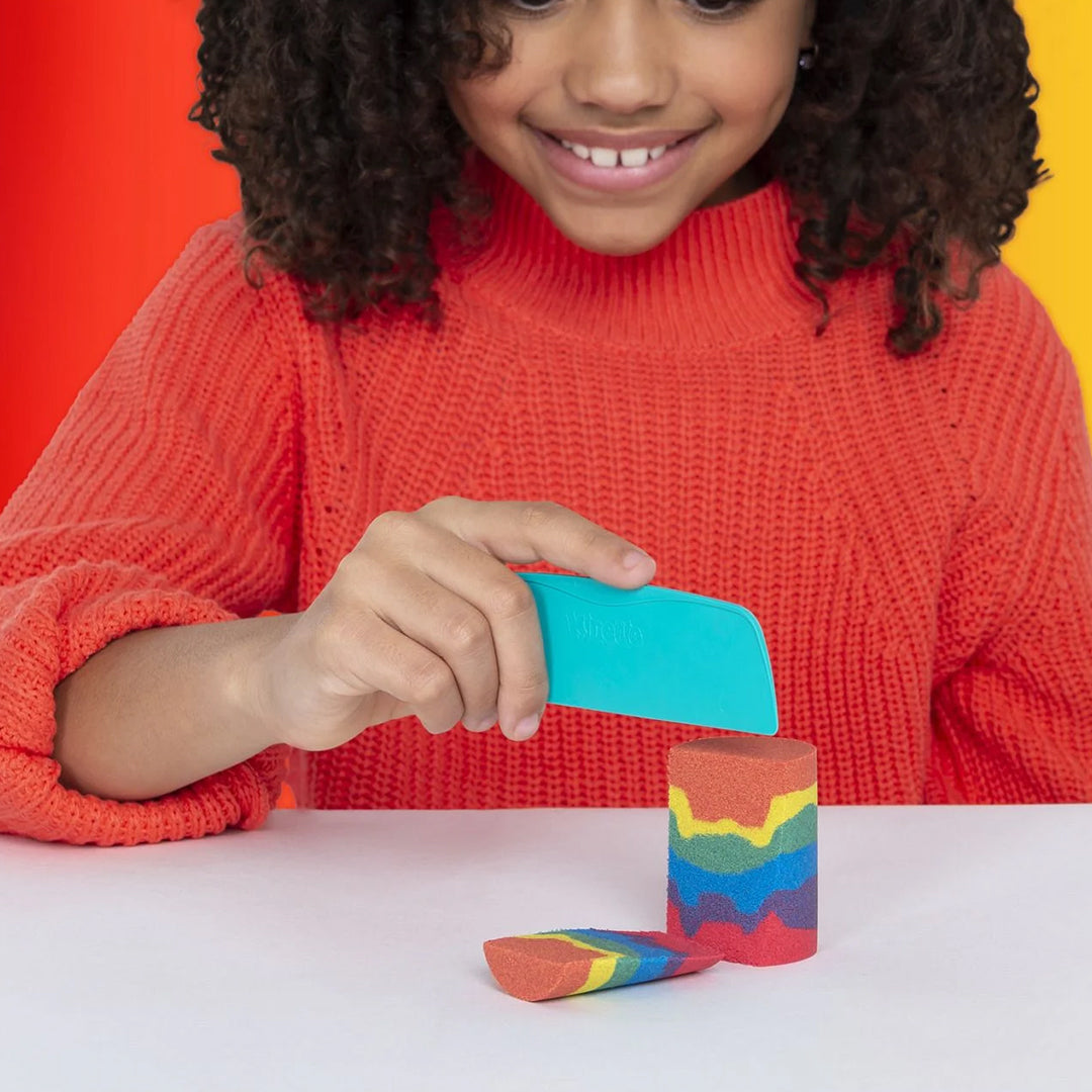 Create mesmerizing rainbow effects with the Kinetic Sand Rainbow Mix Set! This set includes everything you need to mix and create the colours of the rainbow! With six different tools and three primary colours of Kinetic Sand (4.5oz each of red, yellow and blue) in Castle Containers, there are so many ways to create! Kinetic Sand is the original mesmerizing sand that flows through your hands and never dries out, so you can play again and again. Create perfectly-sized portions of Kinetic Sand to help you easily mix together the colours of the rainbow! Snap on one of the three stamps to the squisher tool, layer your sand segments into the stacker mold any way you want, and press down. Remove your creation from the mold to reveal your surprise patterned creation! Slice and dice with the kid-friendly slicer; mix your rainbow creation together; mold colourful castles and create again and again! Let Kinetic Sand flow through your hands – it’s so satisfying, you won’t be able to put it down! Film your sandisfying rainbow creations and create your own videos to share. Create surprise rainbow creations every time with the Kinetic Sand Rainbow Mix Set!