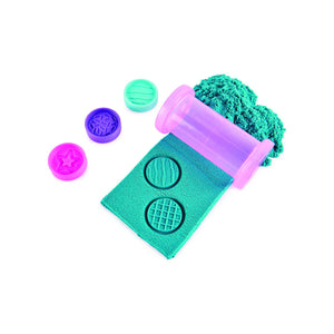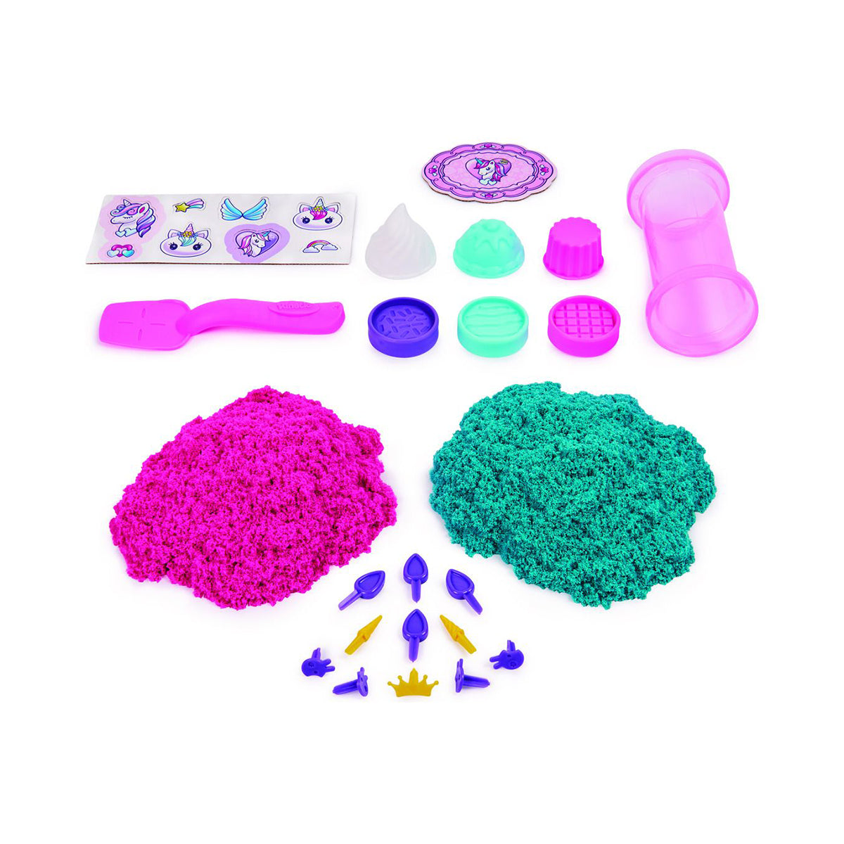 Run the ultimate Kinetic Sand Unicorn Bake Shoppe. This playset features 453g of Kinetic Sand: 226g of shimmer teal and 226g of pink neon sand. Create unicorn cupcakes with the moulds and tools. This set includes 3 cupcake moulds, roller, spatula and 6 unicorn-themed accessories.