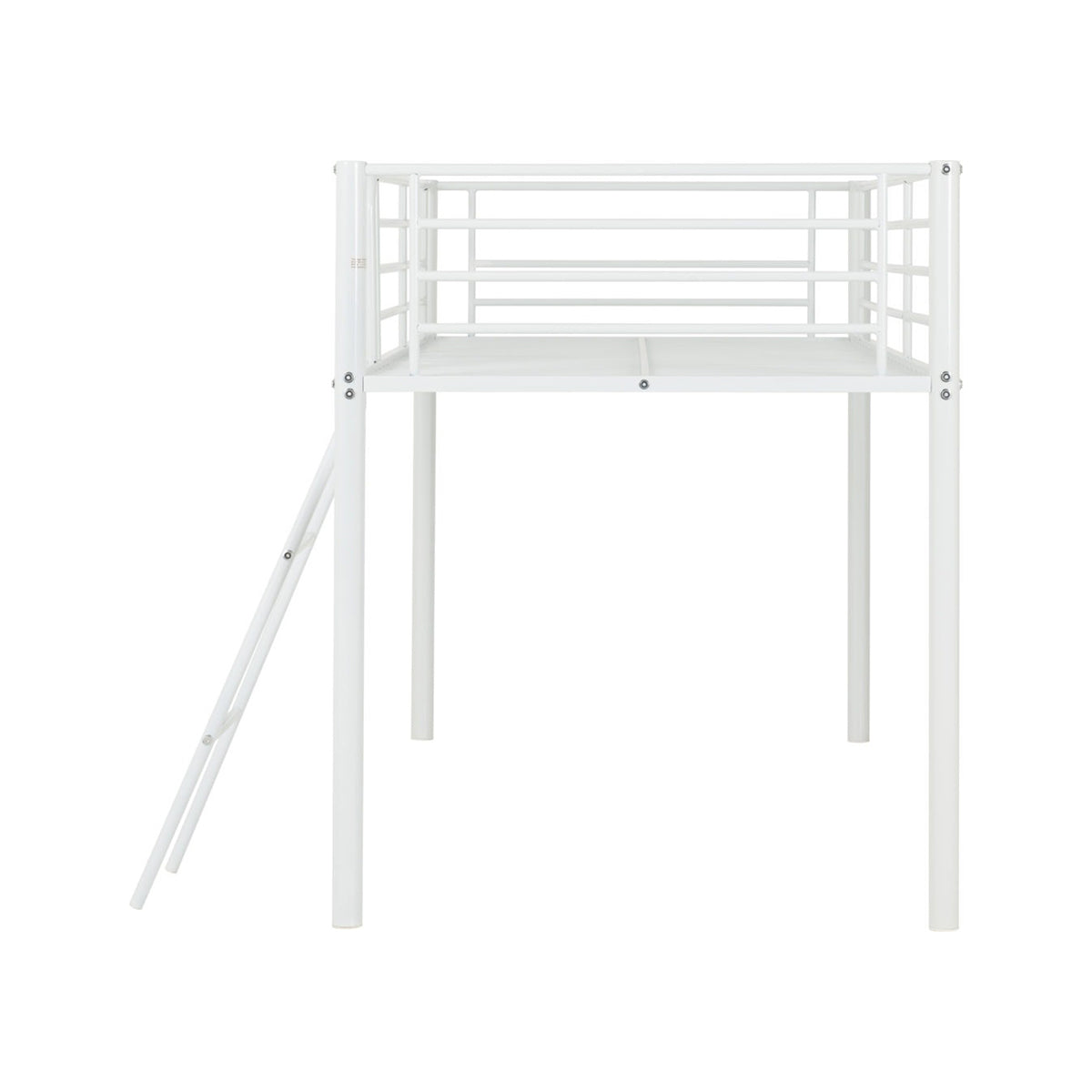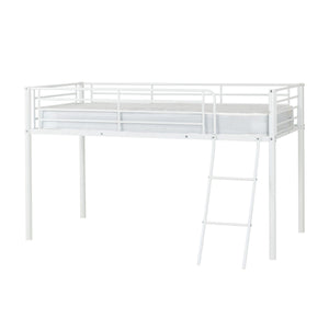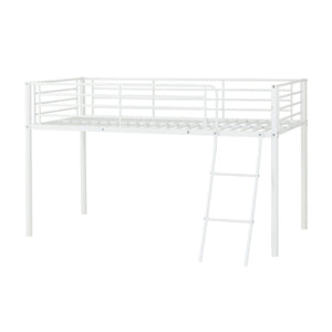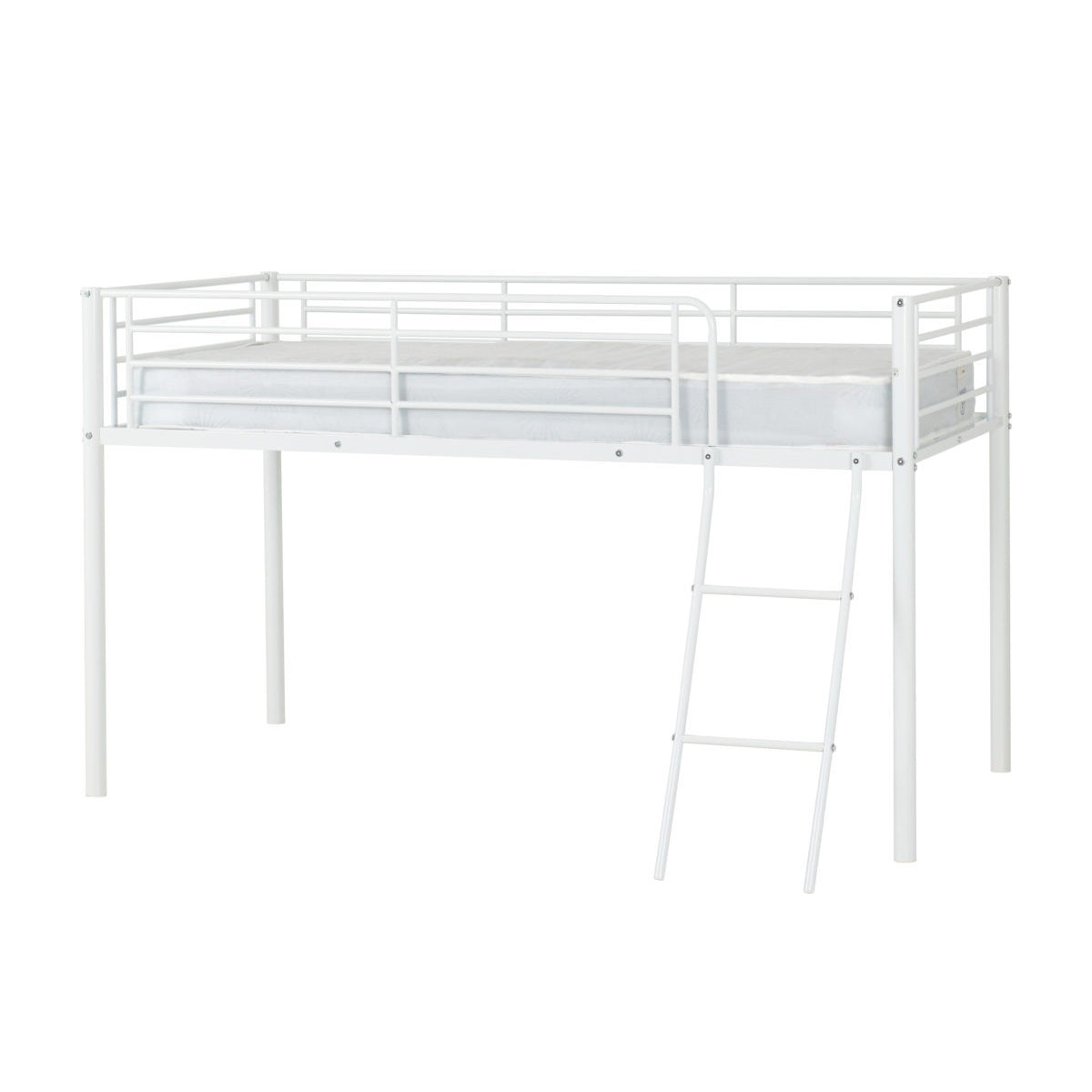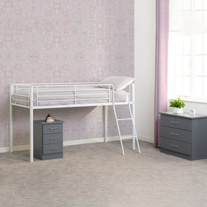 Kora Mid Sleeper Bed Frame. Offering a practical sleeping solution for both children and spare rooms, this bunk bed is simple yet effective. A metal frame offers a sturdy structure, perfect for children’s rooms. Finished in white, black or silver, this bunk bed will seamlessly fit into any interior. This entry level bunk bed has a clean, universal design as well as metal slats to support sleep. Delivered in 1 box, this item is easy to assemble and is perfect for those on a budget.