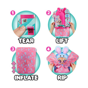This outrageously fun, experiential reveal is bursting with layers of surprises, perfect for endless imaginative and storytelling play for kids. Discover what’s inside by first tearing the zipper at the bottom of the packaging and lifting up the outer pink shell to reveal a mystery wrapping paper, kicking off the first stage of the inflating process! Watch as the paper grows bigger and fuller and once completely inflated, rip open the paper to discover your charming blue bunny costume!