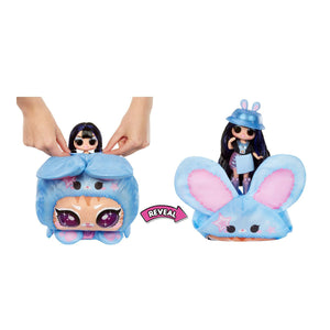 But wait, the surprise doesn’t stop there! Undo the velcro from the back of the bunny’s head to unveil your gorgeous Tweens Aya Cherry doll hidden inside! Don’t forget to unbox the unique surprises and remove the Tweens doll from her doll stand to dress her in trendy new fashions and accessories including a fashionable skirt, stylish hat with bunny ears to match her huggable costume, chic shoes, and cute bow collar!