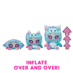 Discover what’s inside by first tearing the zipper at the bottom of the packaging and lifting up the outer pink shell to reveal a mystery wrapping paper, kicking off the first stage of the inflating process! Watch as the paper grows bigger and fuller and once completely inflated, rip open the paper to discover your charming teal kitty costume! But wait, the surprise doesn’t stop there! Undo the velcro from the back of the kitty’s head to unveil your gorgeous Tweens Emma Emo doll hidden inside!
