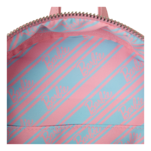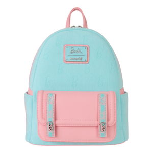 Show off your inner Barbie girl with this stylish Loungefly Classic Barbie Mini Backpack! Crafted from blue terrycloth with faux leather trim, the backpack features subtle Barbie ""B"" icons “burned out” of the fabric for a unique textured design. A pink front pocket with flap closure adds a pop of colour, while metal Barbie ""B"" charms on the pocket straps complete the playful look. Perfect for school, outings, or as a fashion statement, this mini backpack combines style and practicality for Barbie fans everywhere.
