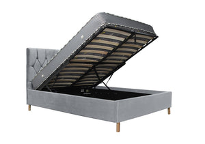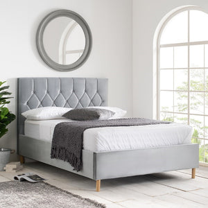 The Loxley bed frame is upholstered in polyester with complementary light feet and is available in grey, green and blue.