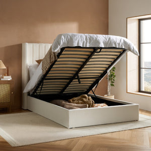 The Maisey Ottoman Bed brings a touch of sophistication and practicality to any bedroom. Upholstered in luxurious white bouclé fabric, this bed features a textured finish that is both visually striking and irresistibly soft to the touch. The bouclé fabric creates a rich, inviting look that adds warmth and style to your bedroom, while maintaining a modern, chic aesthetic.