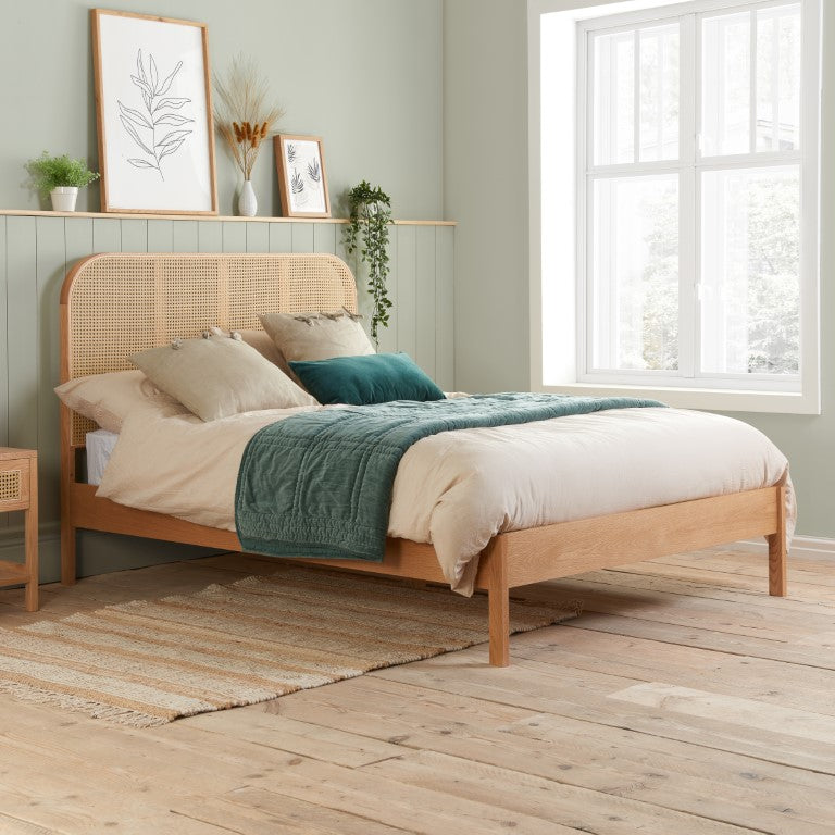 A distinctive design with a contemporary feel, the Margot rattan bed frame is the centrepiece for a modern styled bedroom. The curved rattan headboard offers a contrast against the solid, smooth lines of the frame.