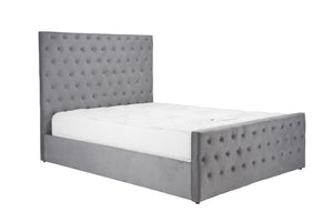 The Marquis bed is upholstered in a luxurious grey velvet and features a beautiful tufted detailing headboard.