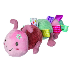 Taggies Camilla Caterpillar is a soft toy friend who is ready for hugs with your little one. Made from luxurious pink, green, and coral fabrics, caterpillar has a sweet smile and adorable stuffed antennae. Camilla is 10 inches in length, a nice size for big hugs. With truly innovative attributes and small beginnings, Taggies has revolutionized and redefined how little ones feel secure and engaged in play. Taggies was born when a mom noticed her child's fascination with satin tags, and blossomed into a world of treasured products. Exploring Taggies textured tags can provide sensory stimulation that babies crave for development and have an amazing calming effect on little ones. Taggies Signature Collection is recognized as the premium line of wonderfully soft and soothing Taggies toys made by Mary Meyer.
