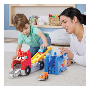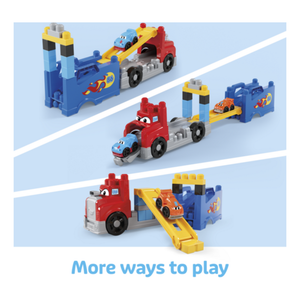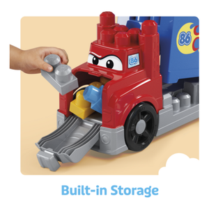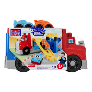 Little racing fans can zoom into adventure with this Mega Bloks Fisher-Price Build and Race Rig. Open the big rig to roll out a buildable race car with real racing sounds! Reconfigure the big rig and use the truck's body as a base for the included building blocks and racetrack pieces. Arrange the ramp different ways to build all kinds of racing stunts. Send the race car down the track to the finish line, then pack up and haul out when you put everything away inside the rig until the next race! First Builders toys are perfect for little hands, providing hands-on play to develop imagination and gross motor skills