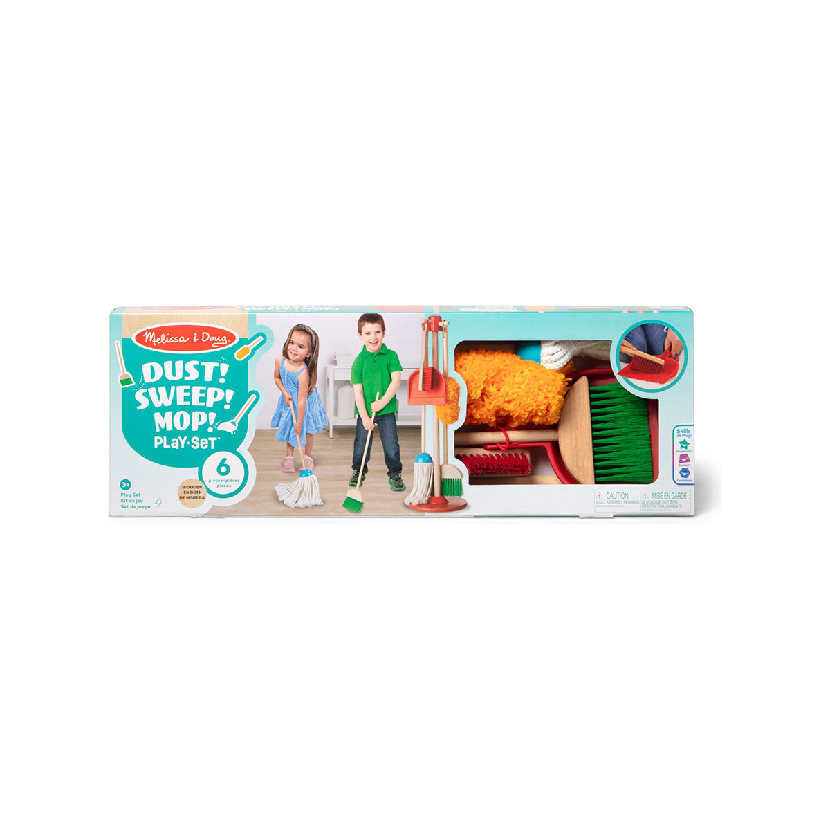 This six-piece play set gives kids all the housekeeping tools they need to keep it clean! Sized just for kids and built to last, the broom, mop, duster, dustpan, and hand brush are comfortable to use and easy to store--just hang them from the sturdy cords onto the included stand for neat, compact storage. (The dustpan can also snap onto any of the handles.) Natural-wood handles add durability and a classic look; bright pops of color keeps lots of fun in the mix!