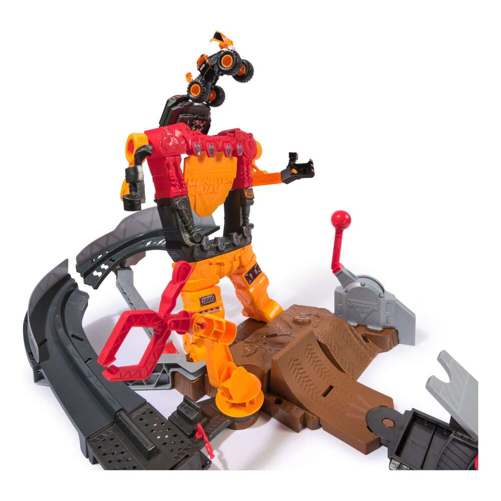 Smash, bash and keep going with the Monster Jam SmashBot Playset with an exclusive Smash & Bash monster truck- fantastic for kids toy gifts for boys and girls ages 3 and up. This playset includes an adjustable launcher, 38,1 cm SmashBot robot where children can launch the exclusive 1:64 scale Smash & Bash JCB Digatron truck. Crash your monster truck toys and repair them back in a couple click to keep the Monster Jam action going. Aim your truck for the robot as you try and take it down. Defeat SmashBot and repair it with a couple cranks for repeat play. With so many other Monster Jam trucks to collect, add Grave Digger, Megalodon, El Toro Loco and more (each sold separately) to your collection and race them all! Monster Jam toys like remote control cars and more to bring the excitement home. Launch into the action with the Monster Jam SmashBot Playset.