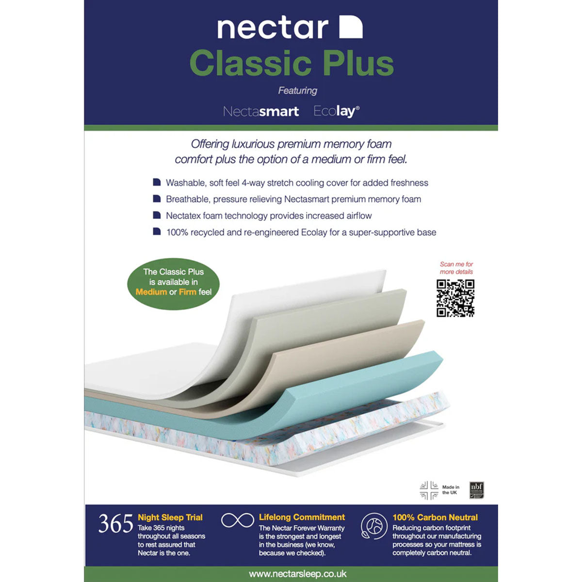 Engineered with exclusive Nectatex™ and Nectar Smart™ technology, the Nectar Classic Plus mattress offers dynamic body contouring that adjusts seamlessly to your movements throughout the night. Whether you prefer a medium or firm feel, this mattress is available in both tensions to provide personalised comfort and support — all night long.