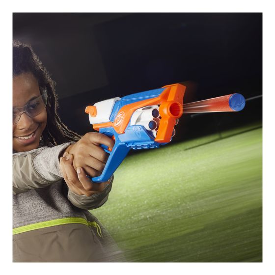 The Nerf N Series Agility dart blaster is built for games in which the action never stops and neither do you! Lightweight, compact, and simple to use, it's a great blaster essential for your Nerf stockpile. The Nerf N Series Agility blaster has a rotating drum with 6-dart capacity, includes 12 Nerf N1 foam darts, and has pull back priming. To play, load darts into the drum, pull back the priming slide, and pull the trigger to fire a dart. Nerf N Series blasters are compatible only with Nerf N Series N1 darts. Eyewear recommended (not included). NERF and HASBRO and all related trademarks and logos are trademarks of Hasbro, Inc. Ages 8 and up TO AVOID EYE INJURY: WARNING: Do not aim at eyes or face. Use of eyewear recommended for players and people within range. Use only official Nerf darts. Other darts may not meet safety standards. Do not modify darts or blaster.