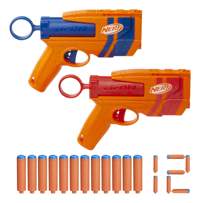 The Nerf N Series Duo Pack includes 2 blasters for double the dart-firing fun! The compact blasters are perfect for when you're moving quickly and need to act fast in Nerf battles. They have 2-dart capacity, pull-back priming, and a tactical rail. The Nerf N Series Duo Pack includes 12 Nerf N1 foam darts, giving you additional darts for reloads. Nerf N Series blasters are compatible only with Nerf N1 darts.. Eyewear recommended (not included).