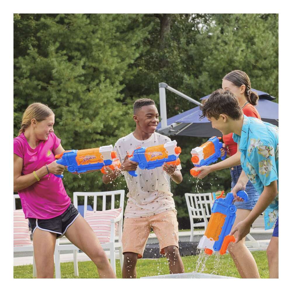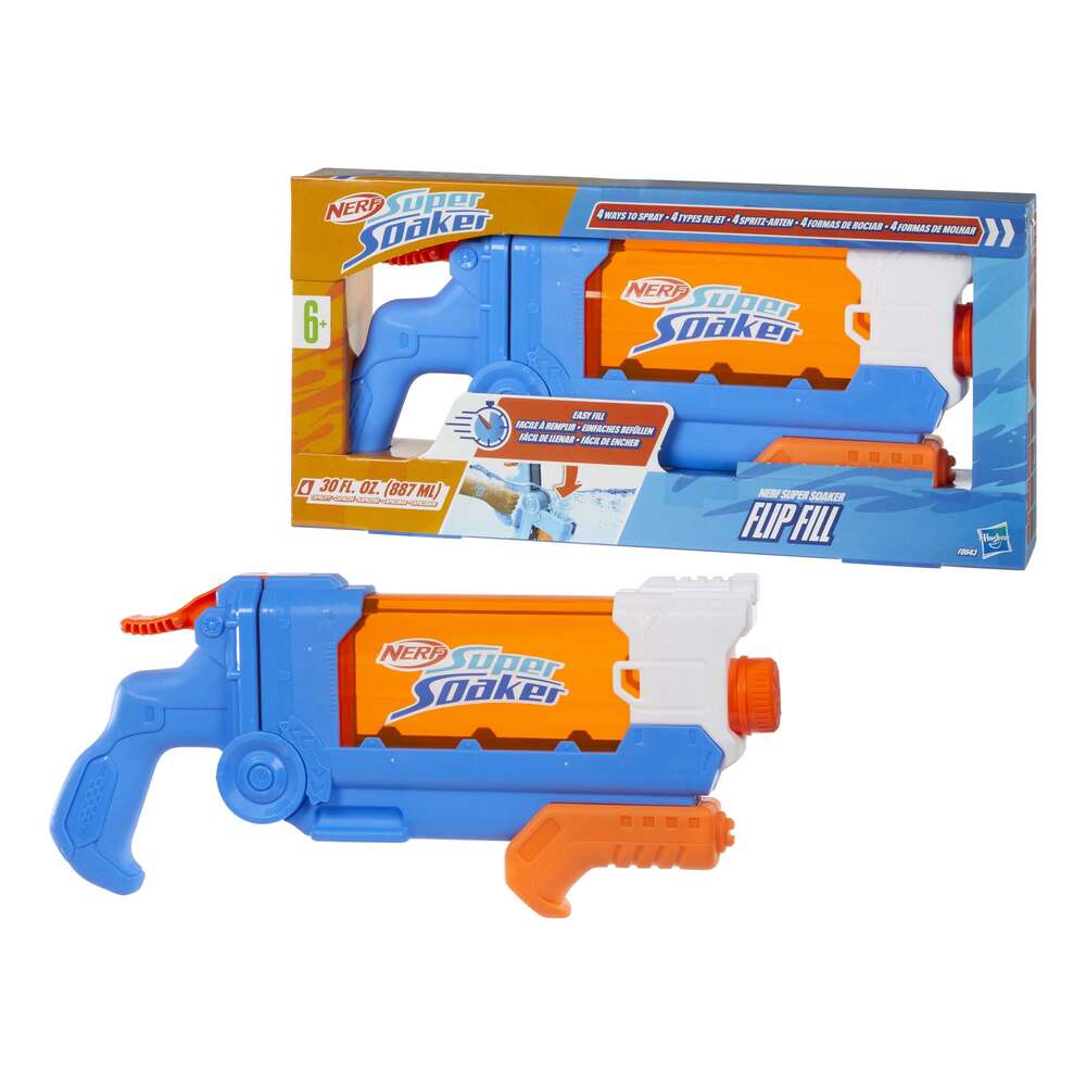 The Nerf Super Soaker Flip Fill water blaster features 4 different water-streaming styles, so you can choose the way you'll soak friends and family in backyard water fun! Simply turn the nozzle on the blaster to unleash a narrow single stream, blast a large single stream, blanket them with a scattering deluge, or pour on the soakage with an angled fan spray. Take aim and pump the slide backward and forward to get the drenching fun going. The blaster has a fast fill design so you're ready to play in outdoor games in no time! The tank holds up to 30 fluid ounces (887 milliliters) of water. Nerf Super Soaker blasters are great kids outdoor water toys and make awesome gifts to get everyone outside for fun, active play that’s a real splash!