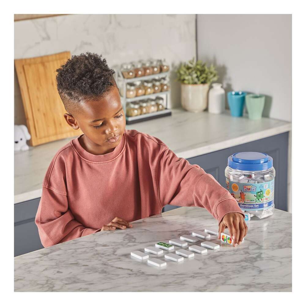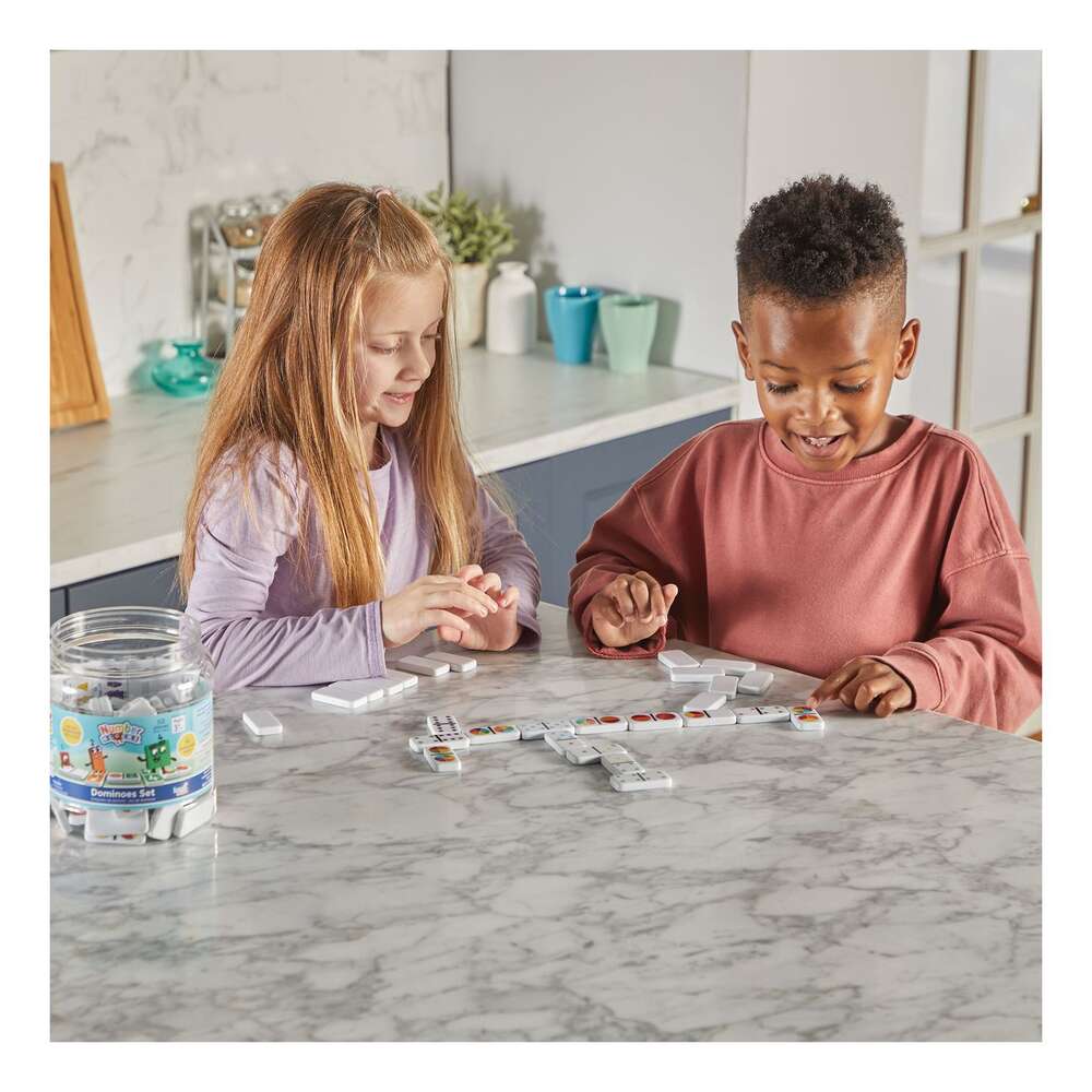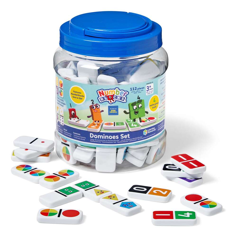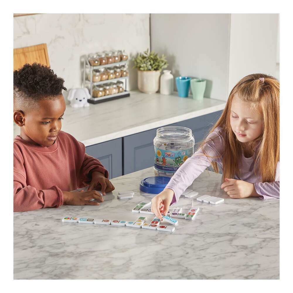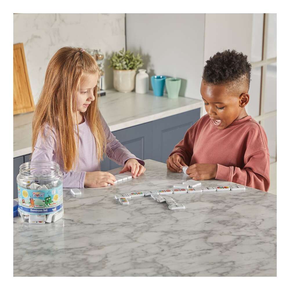 Players explore number identification, counting, addition, multiple representations and more with our Numberblocks® Dominoes Set. This exciting Numberblocks update on a classic childhood game has colourful dominoes which show numbers 1 to 6 in four ways. These are numerals, dots, circle segments, and Numberblocks One to Six as faces in their matching geometric shapes. As children play with these dominoes in the classroom or at home, they learn how a number can be represented in different ways. When the learning fun is over, the dominoes store in their convenient storage tub.