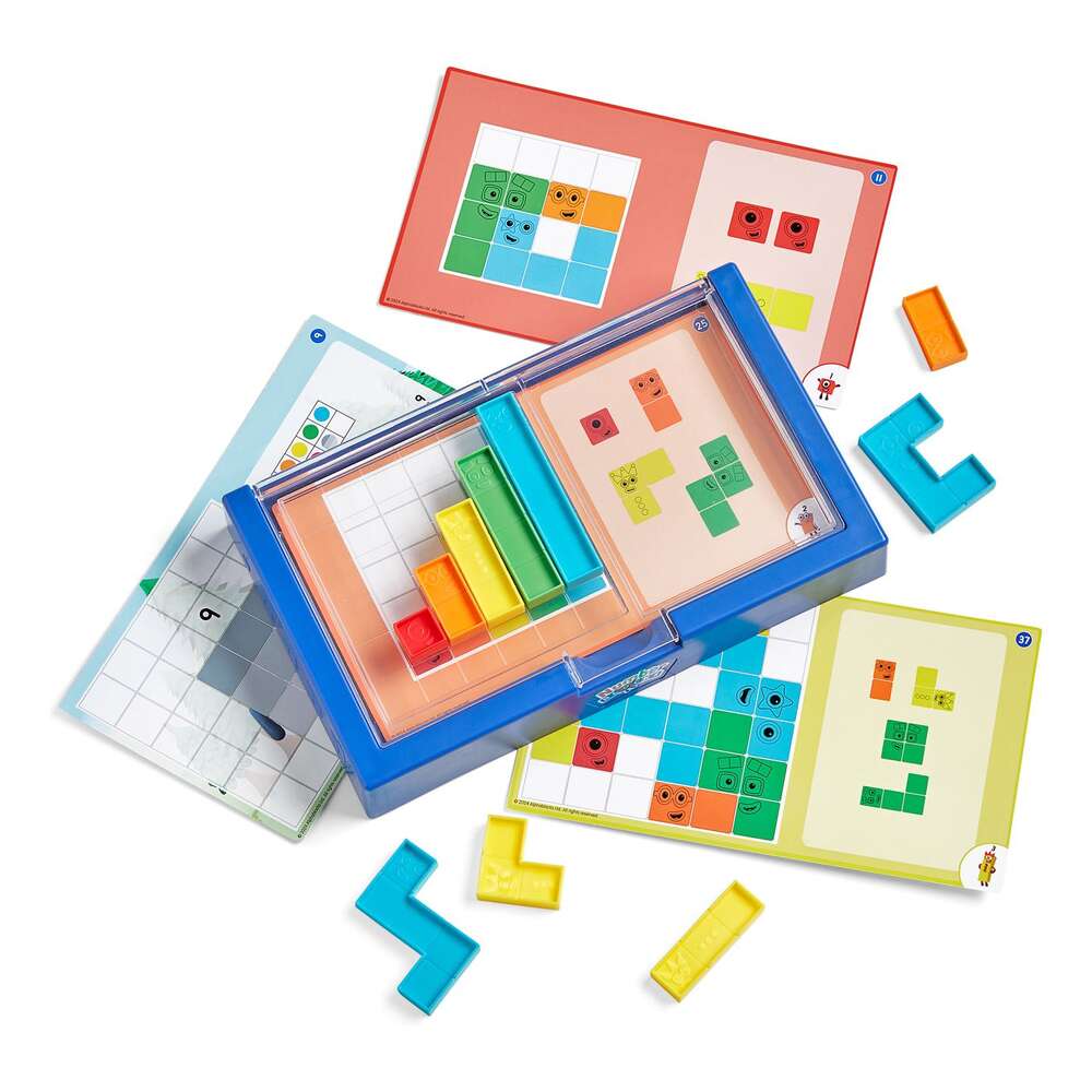 Turn and flip the puzzle pieces based on Numberblocks® One to Fiveto complete the 50 puzzles in this fun game. Inspired by popularepisodes like Stampolines, Puzzle Square, and Building Blocks, thesetactile puzzles challenge children to think critically and improvetheir spatial reasoning skills. The four levels of play increase incomplexity and will keep children engaged and challenged as theygrow and learn. Children can play independently or with a friend,and pieces store inside the game case, making this game ideal foron-the-go fun. Includes 25 double-sided challenge cards and16 character puzzle pieces. 42 Piece Set SMALL PARTS