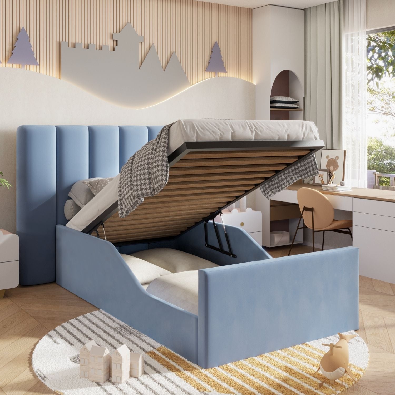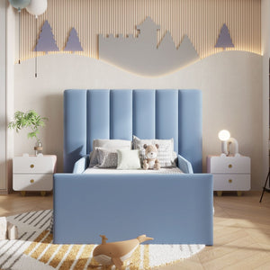 The Zenith Kids Bed is a simple and versatile option for modern settings. With a clean-lined shape and large headboard, it's supported by sprung slats in the base with ottoman options available. We've upholstered it in our soft plush velvet fabric.